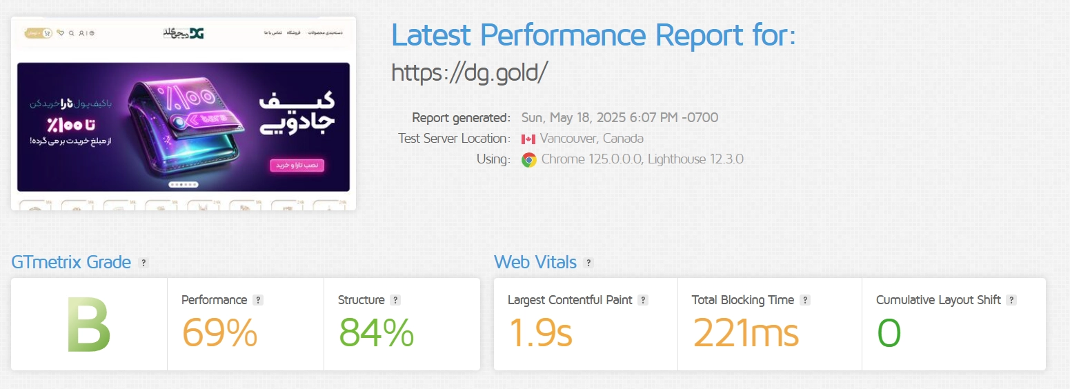 با استفاده از ابزار GTmetrix، سایت به امتیاز B (قابل قبول) رسید: بهینهسازی کامل تصاویر و کدها نمره مناسب در شاخصهای Core Web Vitals